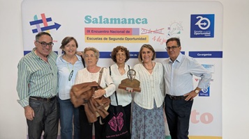 Entrega del premio en Salamanca a miembros de la asociación Enseñantes con Gitanos (4.6.2025) durante el IX encuentro de las Escuelas de 2ª Oportunidad